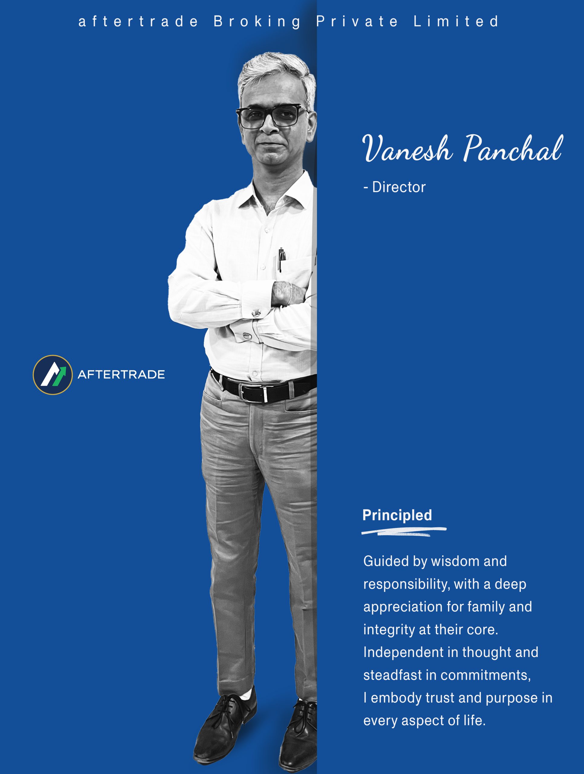 Mr. Vanesh Panchal, Co-founder of Aftertrade Broking Pvt Ltd, is a SEBI-registered stockbroker and a proud member of NSE, BSE, and NSDL. With 29 years of industry expertise, he has mastered Equity, Derivatives, and Currency markets, consistently turning challenges into opportunities and driving success through market highs and lows.